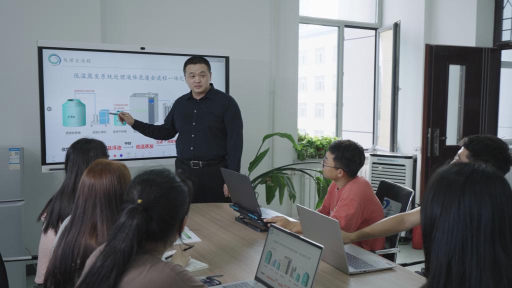 ▲国赛铜奖项目“龙之禹30℃低温蒸发-企业液体危险废物减量化的省钱专家”负责人郭振航与团队成员进行技术研讨