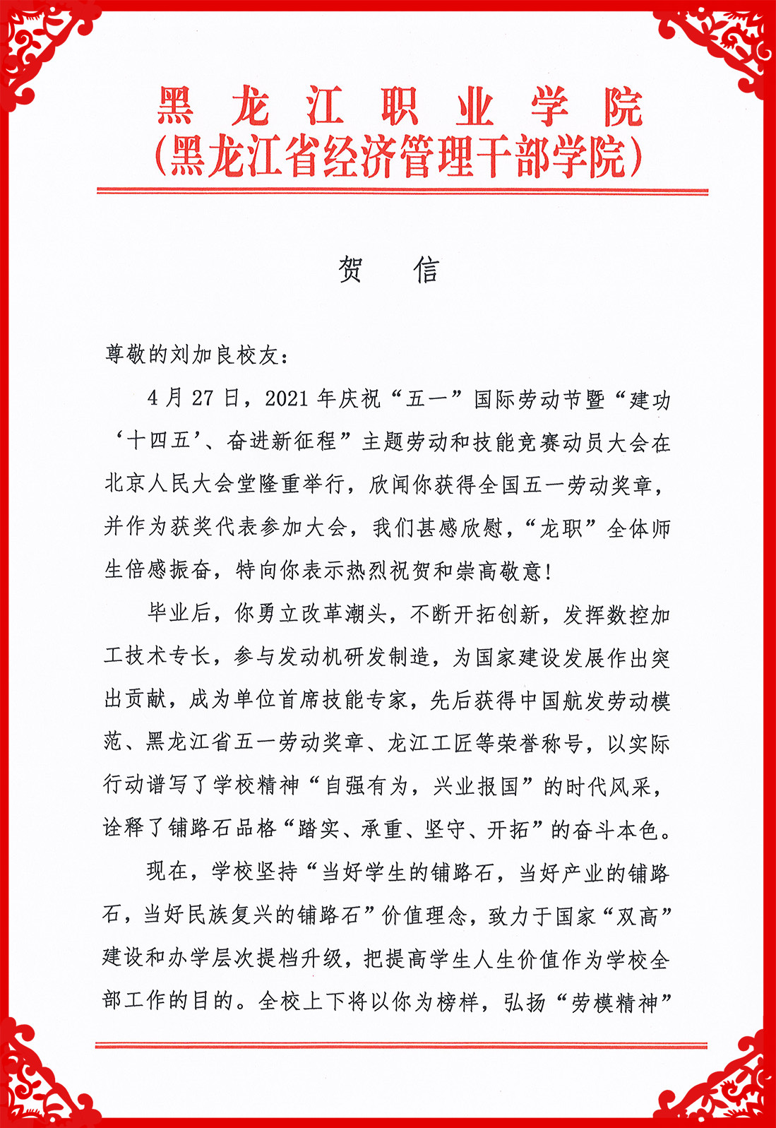 刘加良是母校的骄傲,母校以刘加良为荣!全校师生要以刘加良为榜样,弘扬劳模精神、劳动精神、工匠精神和“龙职”精神,积极践行学校价值理念“当好学生的铺路石,当好产业的铺路石,当好民族复兴的铺路石”,开创学校高质量发展新局面。