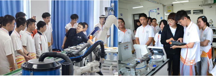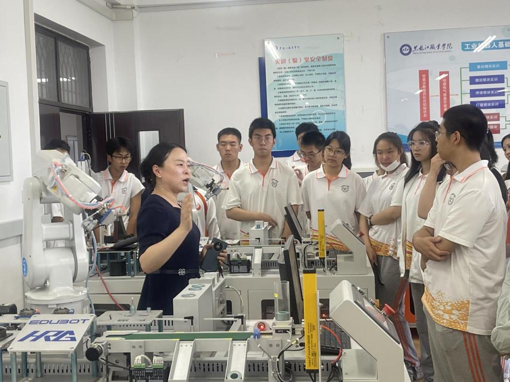 在工业机器人训练中心,鲍敏为学生讲述了工业机器人打破传统工业认知用一双机器臂在汽车制造、电子电气、建筑、食品化工、物流仓储、农业等行业领域的实践。工业机器人技术教研室主任乔阳讲解机器人技术的操作,王莹老师指导学生进行实践操作,扩展了学生们的视野,将科技智能的种子深深埋进同学们的心里。