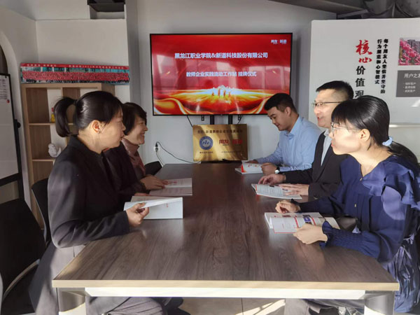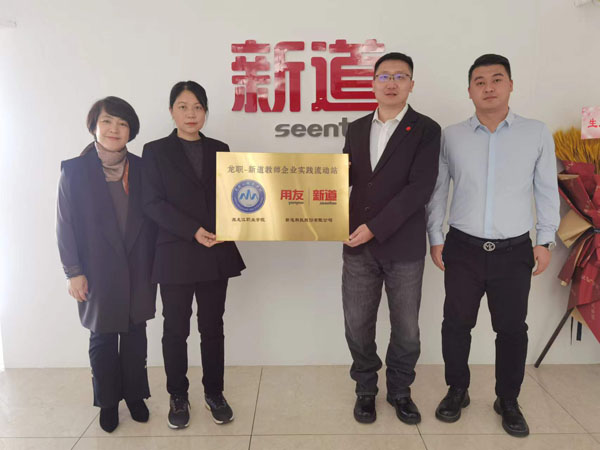 为贯彻《深化新时代职业教育“双师型”教师队伍建设改革实施方案》及《职业教育提质培优行动计划(2020—2023年)》等文件精神要求,进一步探索产教融合、校企合作的长效机制,永利3544am登录官网联合新道科技股份有限公司共建教师企业实践流动站。11月22日,学校会计金融学院会计信息管理教研室主任张丽静、教研室骨干教师韩雪英与新道科技黑龙江省区总经理李毅飞共同为教师企业实践流动站揭牌。
