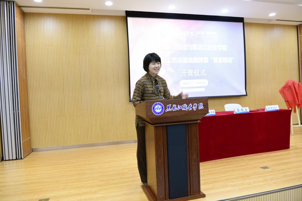 接下来,副校长王明海发表致辞。他首先介绍了当前党中央、国务院对于职业教育的重视程度,习近平总书记对职业教育提出了新的要求,肯定了职业教育的重要地位,指出了职业教育新的办学格局和方向。国务院出台了系列政策文件,倡议职业教育携手行业龙头企业,为国家发展培养高素质技术技能人才。接着,他介绍了学校的办学历史、办学理念和优势以及工商管理学院为服务龙江经济培养优秀人才的突出表现。他表示,学校将大力支持与融创服务集团的产教融合项目,希望双方在现有基础上开展更加深入的合作,开发出更多建设性成果。未来为龙江区域经济发展、融创集团发展、学校学院建设作出更加卓越地贡献。