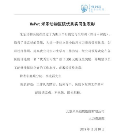 ▲实习生李光磊获米乐动物医院优秀实习生表彰