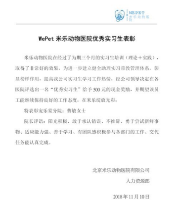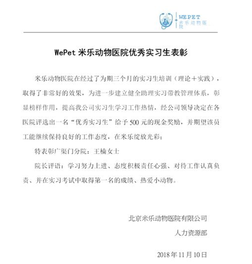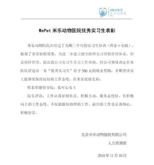 ▲实习生张可心获米乐动物医院优秀实习生表彰