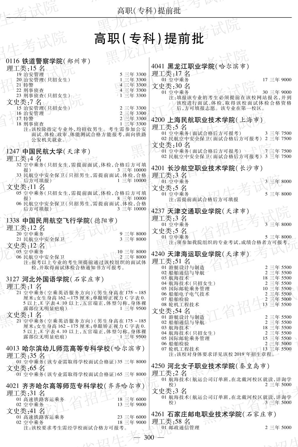 黑龙江省2019年全国普通高校招生计划(空中乘务提前批)P300